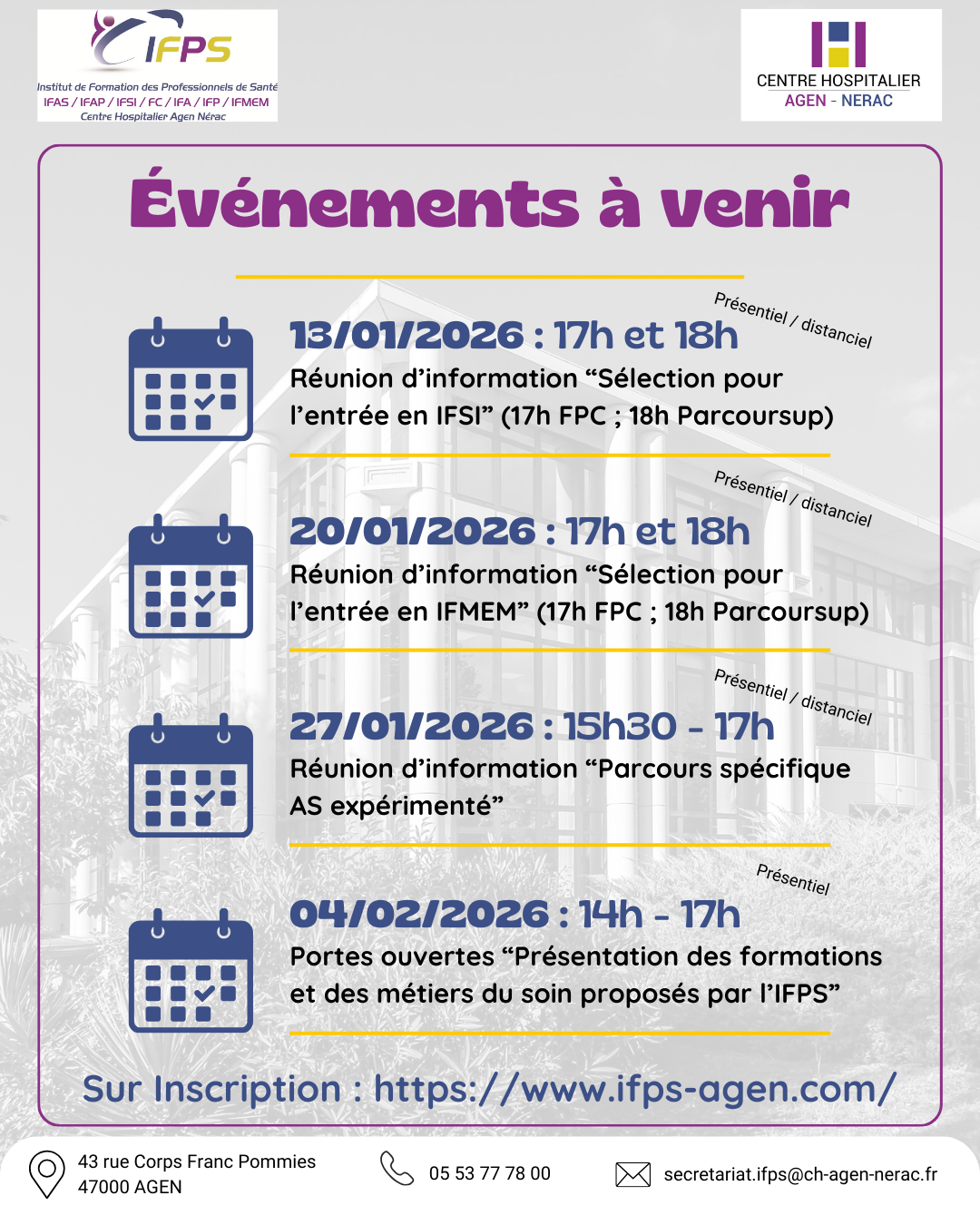 📆 Mercredi 4 février 2026, 14h-17h : Présentation des formations proposées par l’IFPS : Infirmier, infirmier puériculteur, aide-soignant, auxiliaire de puériculture, ambulancier, auxiliaire ambulancier, manipulateur d’électroradiologie médicale et préparation aux sélections d’entrée en formation.